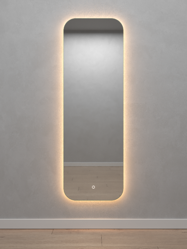 Безрамное зеркало прямоугольной формы с контурной (тыльной) тёплой подсветкой, свет 3000К. Подложка из высококачественного МДФ, светодиодная лента защищена матовым свето-рассеивателем от попадания пыли и влаги. Есть вывод 220W для подключения к сети, включение подсветки от сенсорной кнопки на зеркале, её расположение на зеркале можно выбрать на заказ.